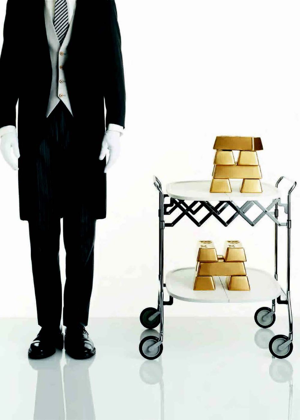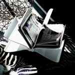 Carrello pieghevole con struttura cromata e piani in nylon nei colori bianco-nero-oltremare-prugna e panna