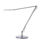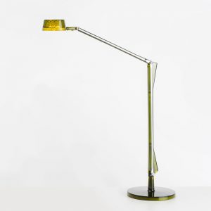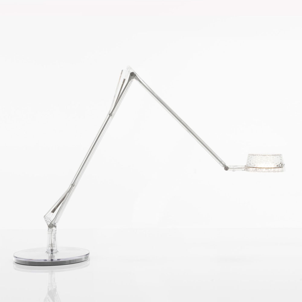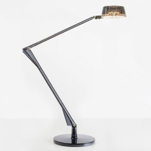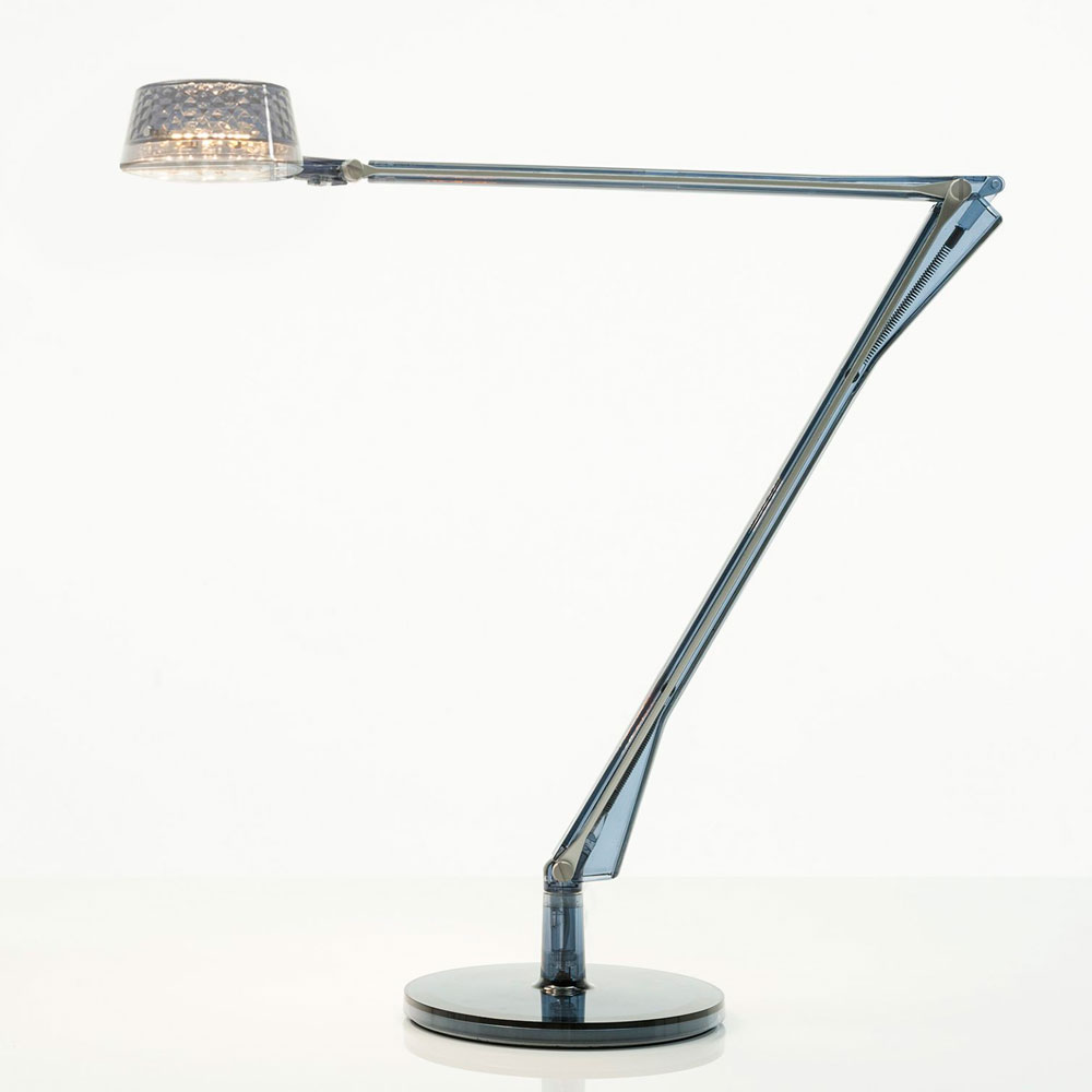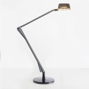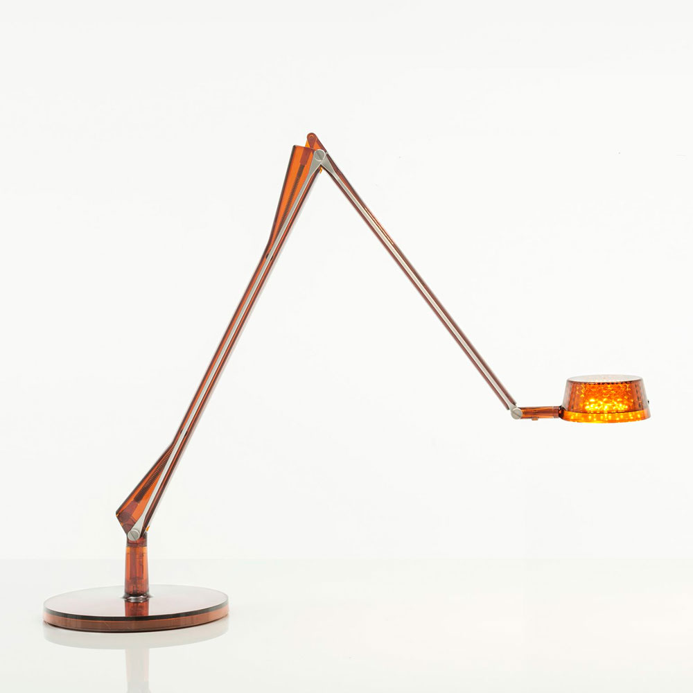 Lampada da tavolo a LED che si contraddistingue per la decorazione sfaccettata del diffusore a cono. Il fascio di luce risulta quindi più ampio e di atmosfera, ideale per un uso home. I due bracci snodati in policarbonato, che compongono la struttura si caratterizzano per la presenza di due stecche in alluminio, che assolvono alla funzione di conduttori. In classe 3, la lampada ha un’alta resa luminosa, circa 600lm con una potenza di 5.6W, che permette un forte risparmio energetico grazie a LED di ultima generazione.