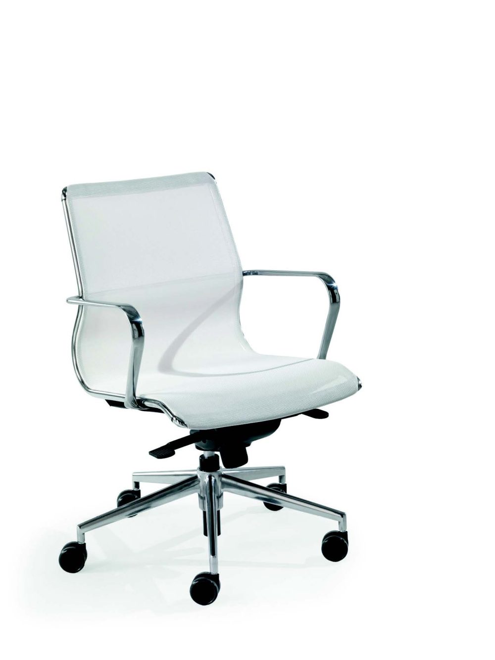 Poltrona direzionale con rete nera, argento, bianca e tortora, oscillante fulcro avanzato 3A, base alluminio lucido, braccioli in alluminio lucidi con ruote auto frenanti gommate