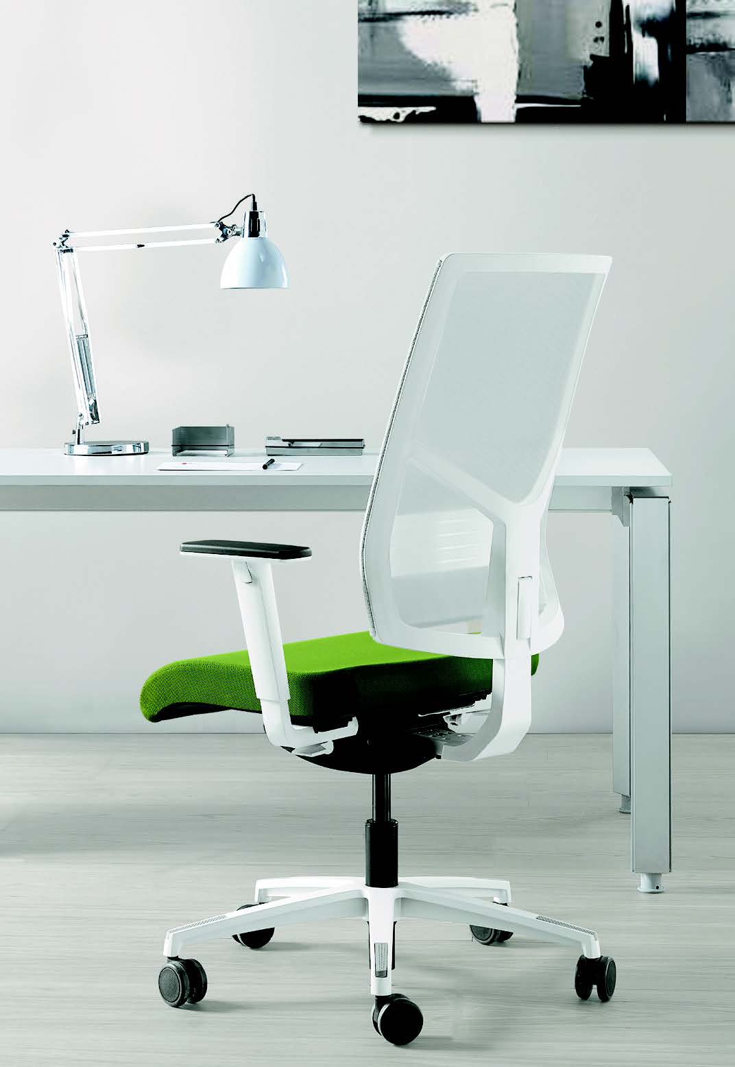 poltrona direzionale PSY6 con meccanismo synchron , con schienale regolabile in altezza con regolazione lombare,rete DESIGN-S-bianca-argilla-rossa- grigia e nera,con sedile imbottito, STRUTTURA e base BIANCA con braccioli regolabili 13BHW e traslatore sedile
