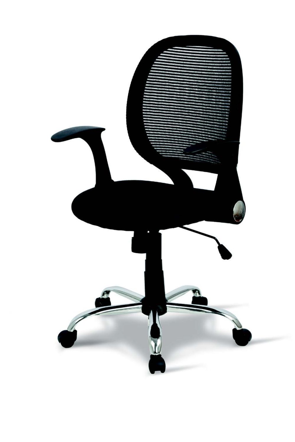 Poltrona operativa con struttura cromata, braccioli in polipropilene neri schienale rivestito in rete nera con sedile imbottito in stoffa solo nera, meccanismo oscillante monoblocco