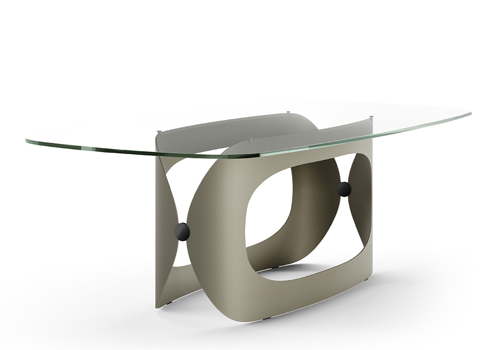 Polifemo nasce dall’unione di due ampi fogli di metallo sapentemente ritagliati e curvati, che formano un “grande occhio, uno scultoreo sostegno per piani di cristallo, ceramica, legno o marmo.
