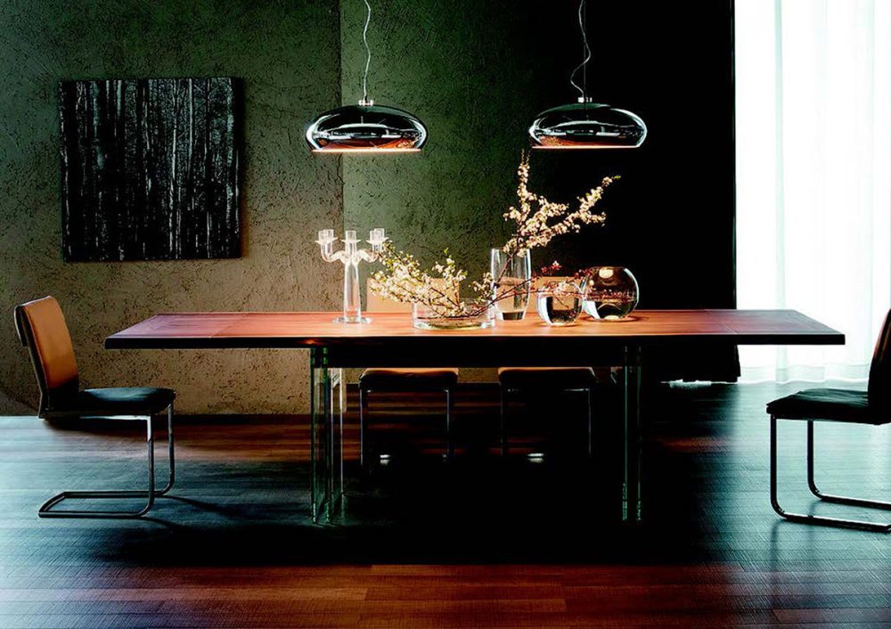 Tavolo allungabile con base in cristallo trasparente extrachiaro mm15 con trave in metallo colore graphite. Piano con bordi irregolari