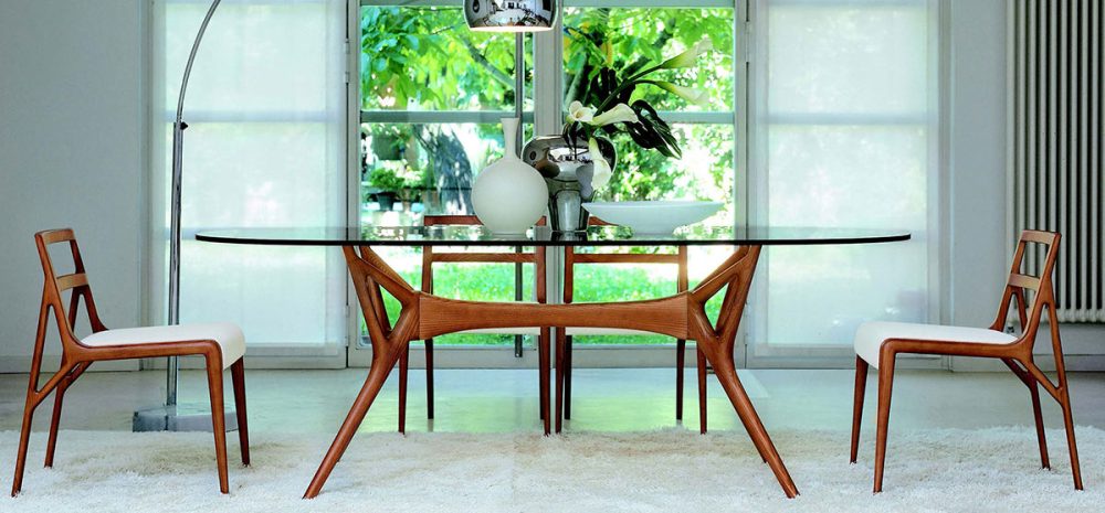 Tavolo fisso con base in massello di noce con piano in cristallo trasparente