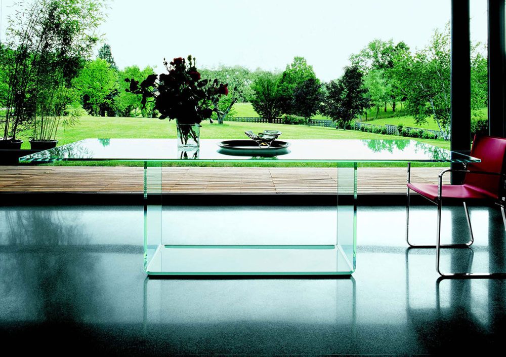 TAVOLO FISSO CON BASE IN VETRO CURVO TRASPARENTE EXTRACHIARO O EXTRACHIARO LACCATO BIANCO,CRETA,ARANCIONE E AVORIO CON PARTE A TERRA TRASPARENTE O LACCATA NO ACIDATA