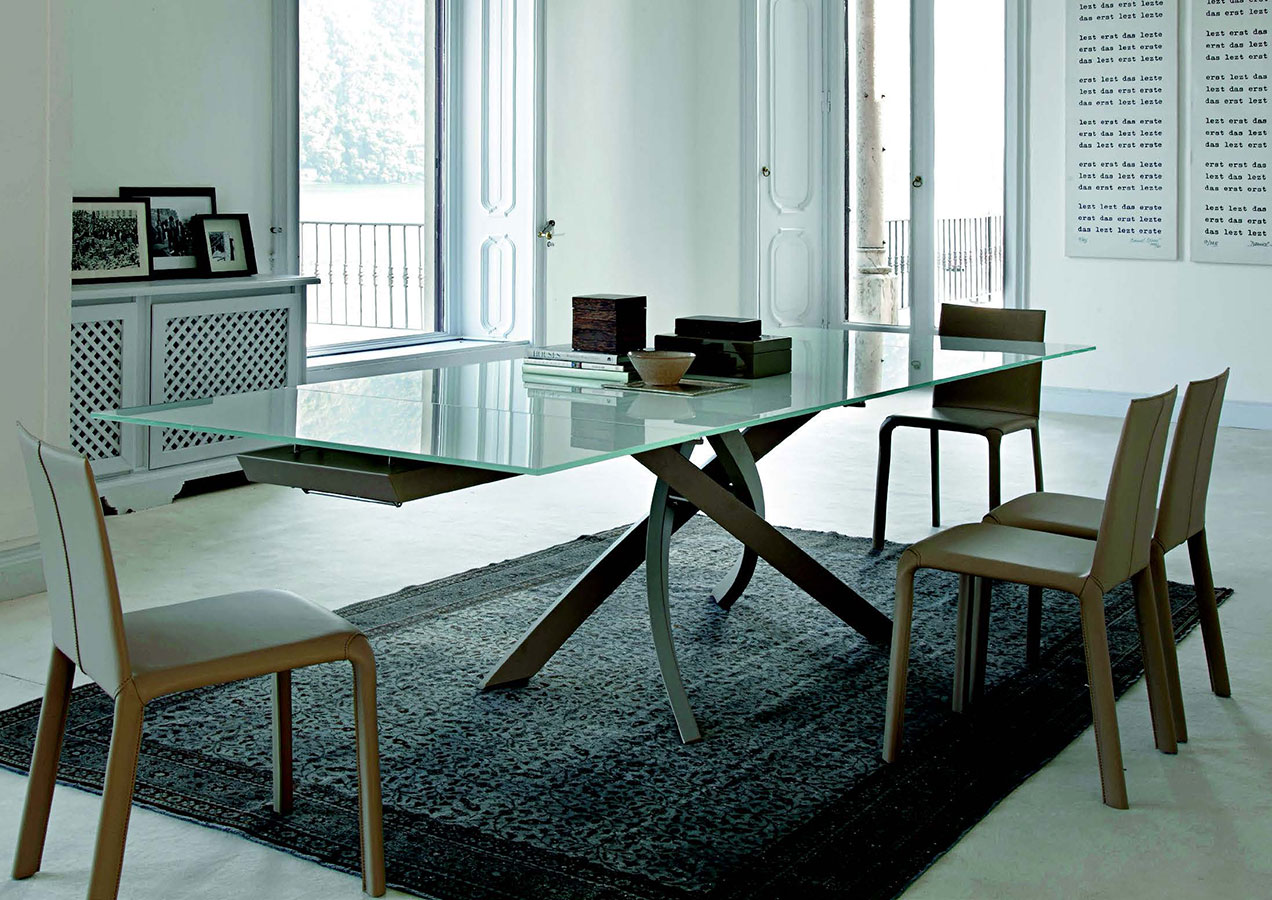 tavolo ALLUNGABILE con base in acciaio verniciato verniciato MONOCOLORE bianco ,sabbia o antracite con piano in cristallo